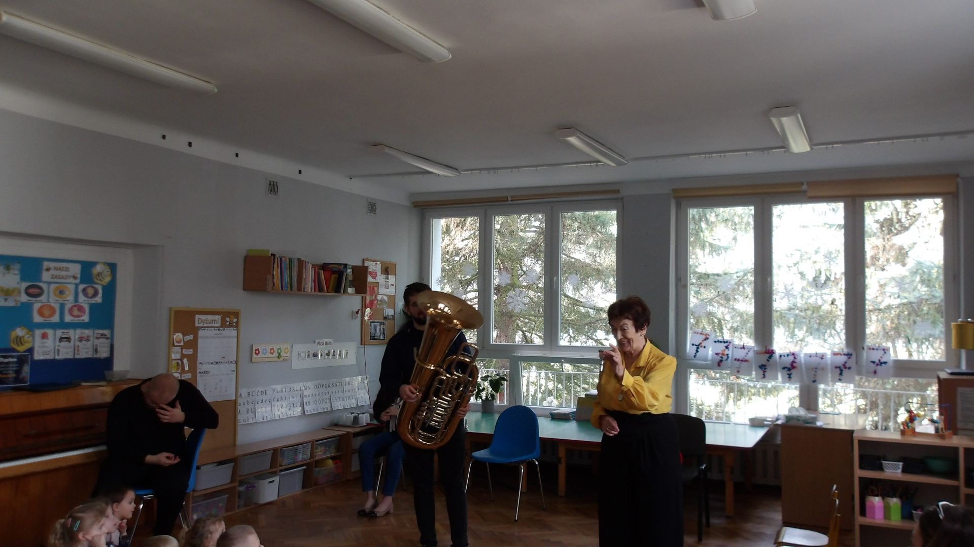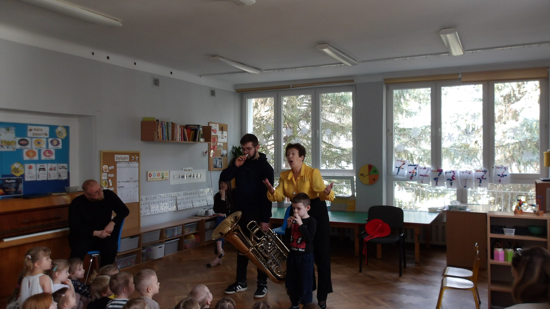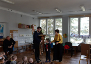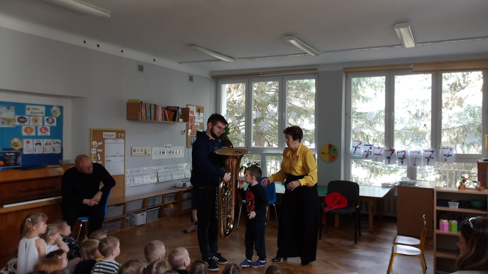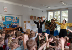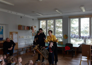 Dnia 27 lutego mieliśmy przyjemność gościć muzyków z Filharmonii Łódzkiej, którzy zaprezentowali dzieciom różnorodność instrumentów muzycznych. Szczególną uwagę zwrócono na tubę - instrument o imponującym brzmieniu. Podczas spotkania dzieci miały okazję zobaczyć tubę z bliska, poznać jej budowę oraz usłyszeć kilka utworów. Muzycy wyjaśnili, jak powstaje dźwięk i jak ważna jest tuba w orkiestrze. Dzieci był zachwycone, gdyż mogły spróbować grać na prostych instrumentach perkusyjnych oraz brać udział w interaktywnej zabawie muzycznej. Wizyta miała na celu rozwijanie zainteresowań muzycznych oraz wprowadzenie dzieci w świat dźwięków klasycznych. Dziękujemy Filharmonii za wspaniałą lekcję i inspirację do dalszego odkrywania muzyki.